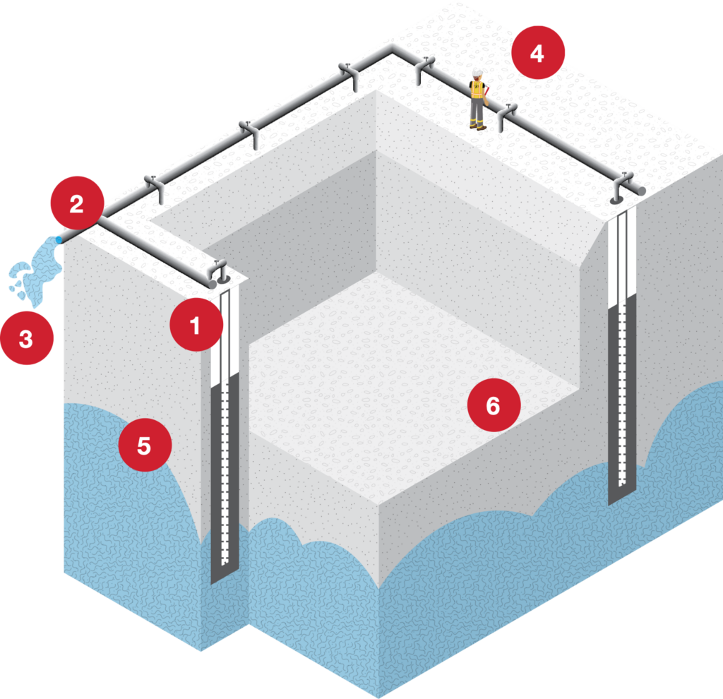 Deep well dewatering systems lower groundwater using a series of drilled wells, each fitted with an electric submersible pump. Deep well systems are often used to remove water from pervious formations that extend well below the excavation.